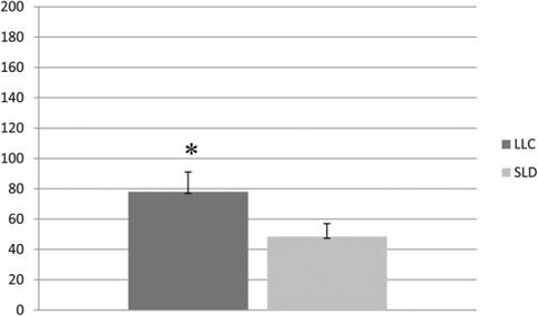 Fig 3) Muscle Activation (expressed as a percentage of maximum voluntary contraction) in different areas of the hamstrings in the lying leg curl (LLC) and the straight leg deadlift (SLD).